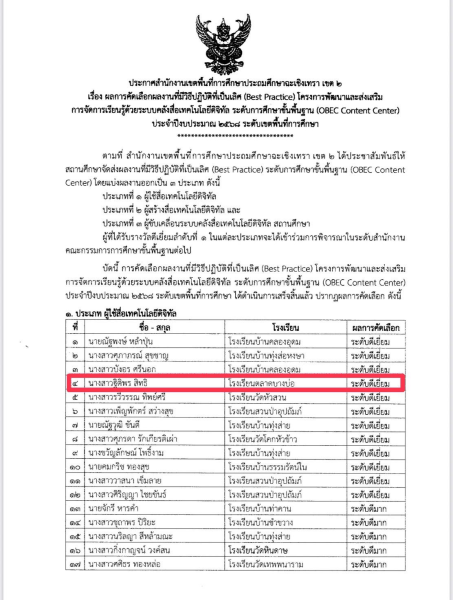 ขอเเสดงความยินดีกับคุณครูฐิติพร สิทธิ ได้รับรางวัล ระดับดีเยี่ยม จากผลการคัดเลือกผลงานที่มีวิธีปฏิบัติที่เป็นเลิศ (Best Practice) ระดับการศึกษาขั้นพื้นฐานโครงการบริหารจัดการและสนับสนุนส่งเสริมการใช้งานคลังความรู้เทคโนโลยีดิจิทัลเพื่อการเรียนรู้(OBEC Content Center) ประจำปีการศึกษา 2568 ระดับเขตพื้นที่การศึกษา