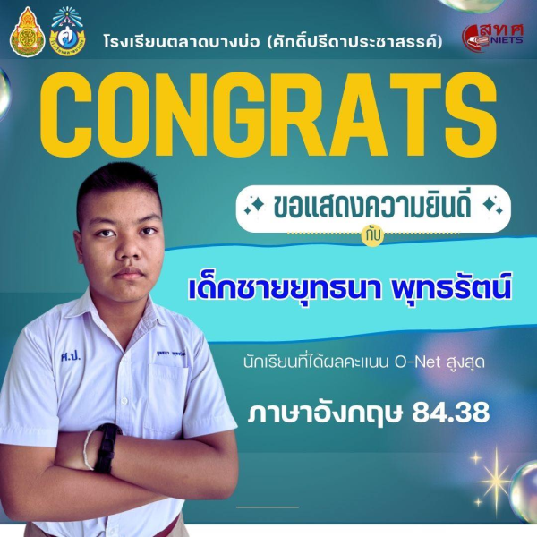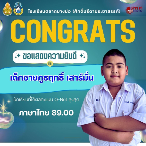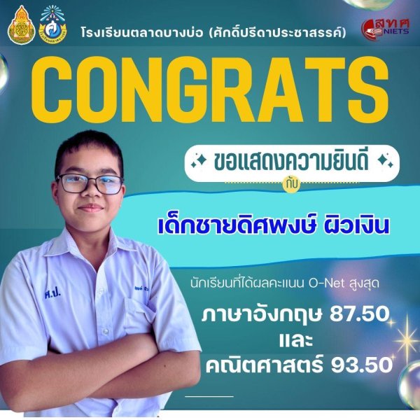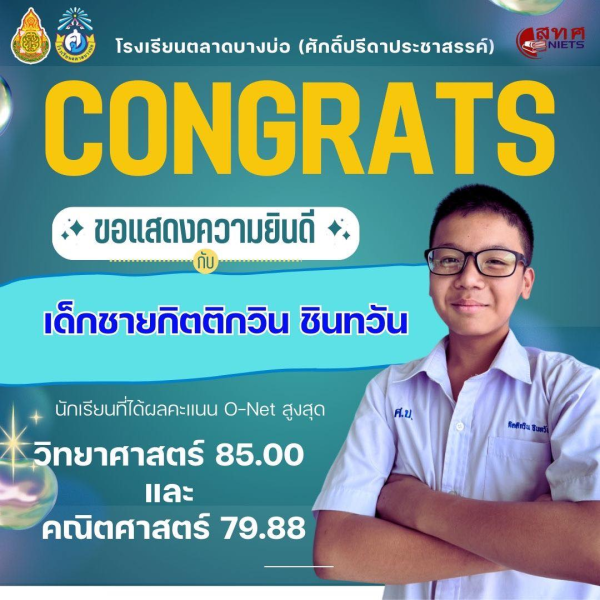 โรงเรียนตลาดบางบ่อ(ศักดิ์ปรีดาประชาสรรค์) 🎉ขอแสดงความยินดีกับนักเรียนชั้นประถมศึกษาปีที่ 6 ที่มีผลการทดสอบทางการศึกษาระดับชาติขั้นพื้นฐาน (O-NET) ปีการศึกษา 2568 สูงสุดของโรงเรียน✨ วิชาคณิตศาสตร์ 🧮 1.เด็กชายดิศพงษ์ ผิวเงิน ได้คะแนน 93.50 2.เด็กชายกิตติกวิน ชินทวัน ได้คะแนน 79.88 วิชาภาษาอังกฤษ 🇬🇧 1.เด็กชายดิศพงษ์ ผิวเงิน ได้คะแนน 87.50 2.เด็กชายยุทธนา พุทธรัตน์ ได้คะแนน 84.38 วิชาวิทยาศาสตร์ 🧑🏻🔬 1.เด็กชายกิตติกวิน ชินทวัน ได้คะแนน 85.00 วิชาภาษาไทย 🇹🇭 1.เด็กชายภูธฤทธิ์ เสาร์มั่น ได้คะแนน 89.00 👏ขอชื่นชมนักเรียนที่มีความมุ่งมั่นตั้งใจ ขอบคุณผู้ปกครองที่ให้การส่งเสริมสนับสนุน ขอบคุณคณะครูทุกท่านที่มีส่วนร่วมในความสำเร็จนี้