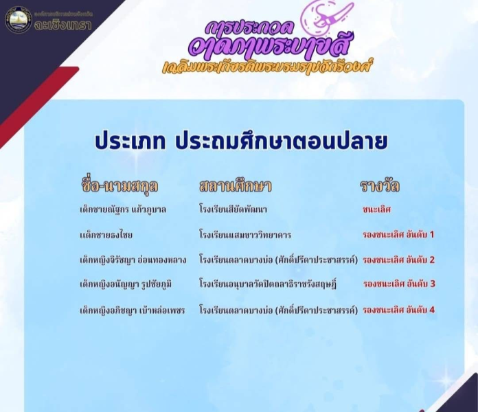 วันที่ 8 สิงหาคม 2568 ว่าที่ร้อยตรีรัฐพงศ์ มีพงษ์ ผู้อำนวยการโรงเรียนตลาดบางบ่อ(ศักดิ์ปรีดาประชาสรรค์) มอบหมายให้นายพุทธชาติ ชูเรือง นำนักเรียนเข้ารับรางวัล การแข่งขันประกวดวาดภาพระบายสี เฉลิมพระเกียรติพระบรมราชจักรีวงศ์ ประจำปี 2568 ประเภท ประถมศึกษาตอนปลาย ผลการแข่งขันดังนี้ รางวัลรองชนะเลิศ อันดับ ๒ เด็กหญิงจิรัชญา อ่อนทองหลาง รางวัลรองชนะเลิศ อันดับ ๔ เด็กหญิงอภิชญา เบ้าหล่อเพชร โดยมีนายพุทธชาติ ชูเรือง เป็นครูผู้ฝึกซ้อม ณ ห้องประชุมบางแก้ว องค์การบริหารส่วนจังหวัดฉะเชิงเทรา