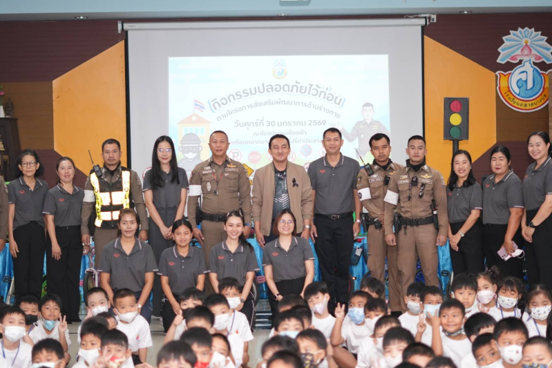 วันที่ 30 มกราคม 2569 ว่าที่ร้อยตรีรัฐพงษ์ มีพงศ์ ผู้อำนวยการโรงเรียนตลาดบางบ่อ(ศักดิ์ปรีดาประชาสรรค์) มอบหมายให้คณะครูปฐมวัย ร่วมกับสถานีตำรวจภูธรแปลงยาว จัดกิจกรรม “ปลอดภัยไว้ก่อน ระดับปฐมวัย” เพื่อเสริมสร้างความรู้ ทักษะ และวินัยด้านความปลอดภัยในชีวิตประจำวันให้แก่เด็กปฐมวัย การจัดกิจกรรมในครั้งนี้ได้รับความอนุเคราะห์จากท่าน พ.ต.อ.ปรีชา นิสัยสม ผู้กำกับการสถานีตำรวจภูธรแปลงยาว พ.ต.ท.วีระชัย พรานอังกูร รองผู้กำกับการป้องกันปราบปราม และ พ.ต.ท.สมคิด พลมัน สารวัตรป้องกันปราบปราม สภ.แปลงยาว โดยมี ร.ต.อ.ฉันทวัฒน์ โคตรโยธา รองสารวัตรจราจร สภ.แปลงยาว พร้อมด้วยสายตรวจจราจร ทำหน้าที่เป็นวิทยากร อบรมให้ความรู้ผ่านฐานกิจกรรมหนี ซ่อน สู้ และฐานกิจกรรมวินัยจราจร โดยมีการจำลองสถานการณ์เสมือนจริงเพื่อให้เด็กได้เรียนรู้ขั้นตอนการเอาตัวรอดอย่างถูกต้อง และยังได้เรียนรู้กฏจราจรขั้นพื้นฐาน การข้ามถนนอย่างปลอดภัย และการสวมหมวกนิรภัยอย่างถูกต้อง