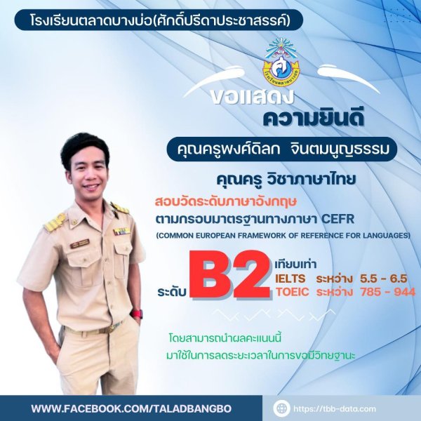 โรงเรียนตลาดบางบ่อ(ศักดิ์ปรีดาประชาสรรค์) มีความภาคภูมิใจในตัวคุณครูพงศ์ดิลก จินตมนูญธรรม ที่สอบผ่านการวัดระดับภาษาอังกฤษตามกรอบมาตรฐาน CEFR ระดับ B2 👉ความทุ่มเทในการพัฒนาตนเองของครูเป็นแรงบันดาลใจอันยิ่งใหญ่ ไม่มีความสำเร็จไหน ที่ไม่ต้องใช้ความพยายาม 👉เมื่อครูเก่ง นักเรียนก็จะไม่เก่งได้อย่างไร 👏