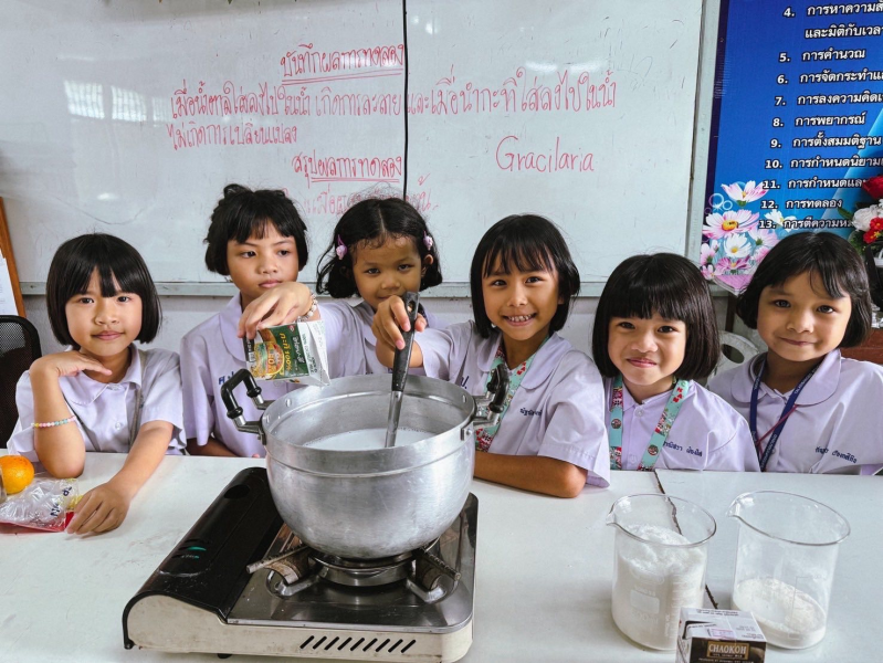 ชั่วโมงวิทยาศาสตร์กับหน่วยการเรียนรู้สมบัติที่เกิดจากการผสมกันของวัสดุ ชื่อการทดลอง “วุ้นกะทิแสนอร่อย” สรุปหลักการทางวิทยาศาสตร์ การทำวุ้นกะทิเป็นกระบวนการผสมของสารหลายชนิด เช่น น้ำ ผงวุ้น น้ำตาล และกะทิ ซึ่งเมื่อให้ความร้อน สารบางชนิดละลายรวมกัน (สารเนื้อเดียว) และเมื่อเย็นลง วุ้นจะแข็งตัว เป็นรูปร่างต่างๆได้ สามารถนำความรู้สมบัติที่เกิดจากการผสมกันของวัสดุไปใช้ประโยชน์ในชีวิตประจำวันได้ เช่น การทำอาหารและการทำขนม